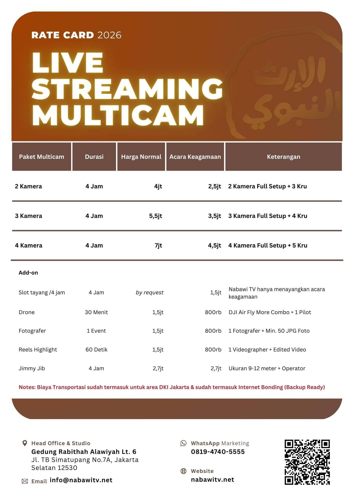 Paket Live Streaming ini adalah jasa produksi untuk menayangkan acara di kanal milik Anda sendiri (YouTube/Zoom/Medsos Klien). Jika Anda ingin acara tersebut disiarkan secara resmi di Channel YouTube & TV Satelit Nabawi TV (sebagai program partner), akan dikenakan Biaya Slot Tayang terpisah. Hubungi tim marketing kami untuk paket kolaborasi media (Media Partnership).