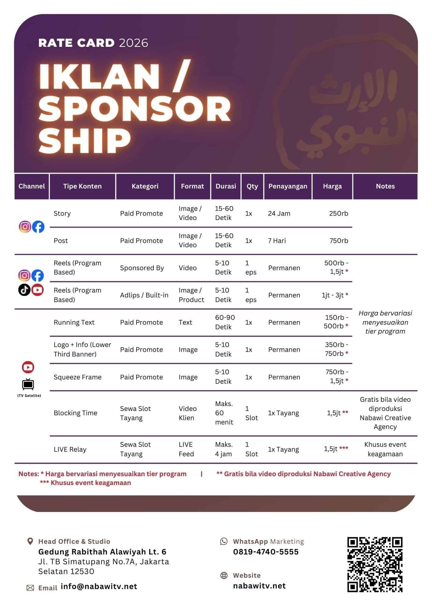 Promosikan brand Anda di Nabawi TV. Jangkau ribuan audiens Muslim spesifik melalui website dan media sosial kami yang terpercaya